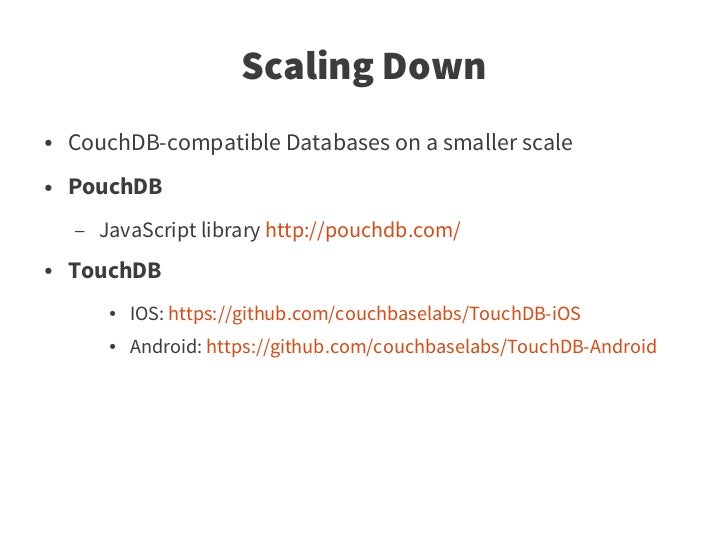 74. 74. Scaling Down ● CouchDB-compatible Databases on a smaller scale ● PouchDB – JavaScript library http://pouchdb.com/ ● TouchDB ● IOS: https://github.com/couchbaselabs/TouchDB-iOS ● Android: https://github.com/couchbaselabs/TouchDB-Android