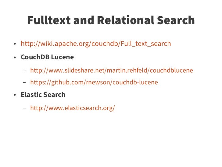 75. 75. Fulltext and Relational Search ● http://wiki.apache.org/couchdb/Full_text_search ● CouchDB Lucene – http://www.slideshare.net/martin.rehfeld/couchdblucene – https://github.com/rnewson/couchdb-lucene ● Elastic Search – http://www.elasticsearch.org/