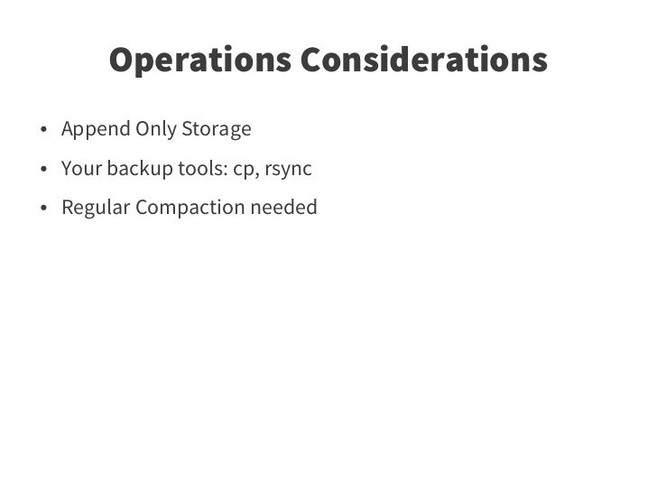 76. 76. Operations Considerations ● Append Only Storage ● Your backup tools: cp, rsync ● Regular Compaction needed