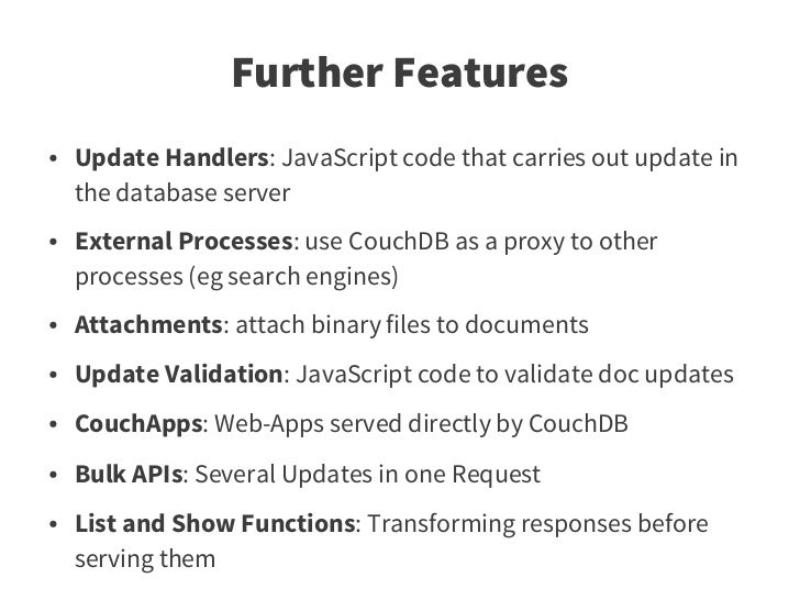 77. 77. Further Features ● Update Handlers: JavaScript code that carries out update in the database server ● External Processes: use CouchDB as a proxy to other processes (eg search engines) ● Attachments: attach binary files to documents ● Update Validation: JavaScript code to validate doc updates ● CouchApps: Web-Apps served directly by CouchDB ● Bulk APIs: Several Updates in one Request ● List and Show Functions: Transforming responses before serving them