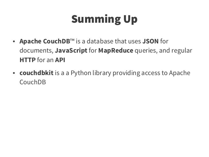 78. 78. Summing Up ● Apache CouchDB™ is a database that uses JSON for documents, JavaScript for MapReduce queries, and regular HTTP for an API ● couchdbkit is a a Python library providing access to Apache CouchDB