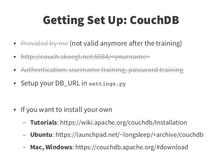 9. 9. Getting Set Up: CouchDB ● Provided by me (not valid anymore after the training) ● http://couch.skoegl.net:5984/<yourname> ● Authentication: username training, password training ● Setup your DB_URL in settings.py ● If you want to install your own – Tutorials: https://wiki.apache.org/couchdb/Installation – Ubuntu: https://launchpad.net/~longsleep/+archive/couchdb – Mac, Windows: https://couchdb.apache.org/#download