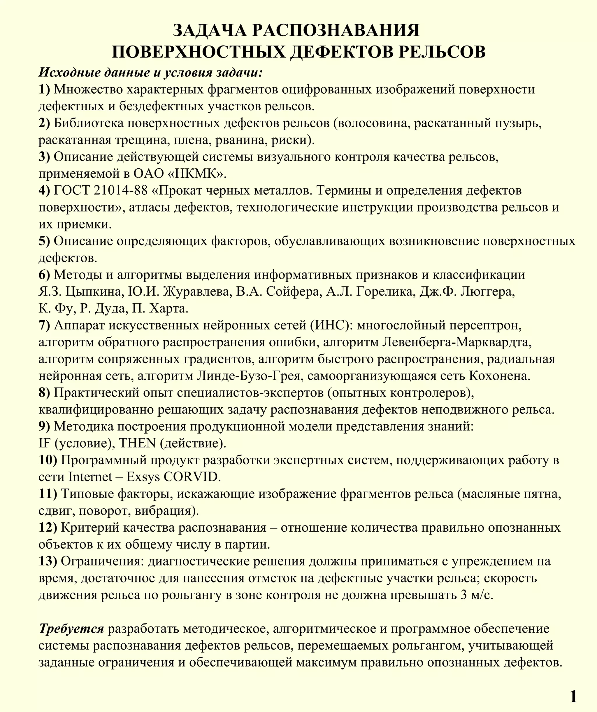 Документ описывает систему распознавания поверхностных дефектов рельсов, основанную на анализе оцифрованных изображений и использовании нейронных сетей для классификации дефектов. Включает описание библиотек дефектов, алгоритмов, методов обработки изображений и критериев качества диагностики. Также обсуждаются аппаратные и программные компоненты системы, ограничения на скорость распознавания и требования к коррекции изображений.