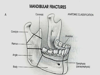 Mandible fractures are common facial injuries that can be treated with either closed or open reduction methods depending on the severity and location of the fracture. Closed reduction using maxillomandibular fixation is preferred for non-displaced or favorable fractures in children and adults. Open reduction with rigid internal fixation using plates, screws, or external fixation is used for displaced, unfavorable, or comminuted fractures. Condylar fractures may be treated with closed reduction for children but often require open reduction in adults due to higher risk of complications from malunion. Immediate postoperative mobilization after open reduction has been shown to have similar outcomes to traditional maxillomandibular fixation.