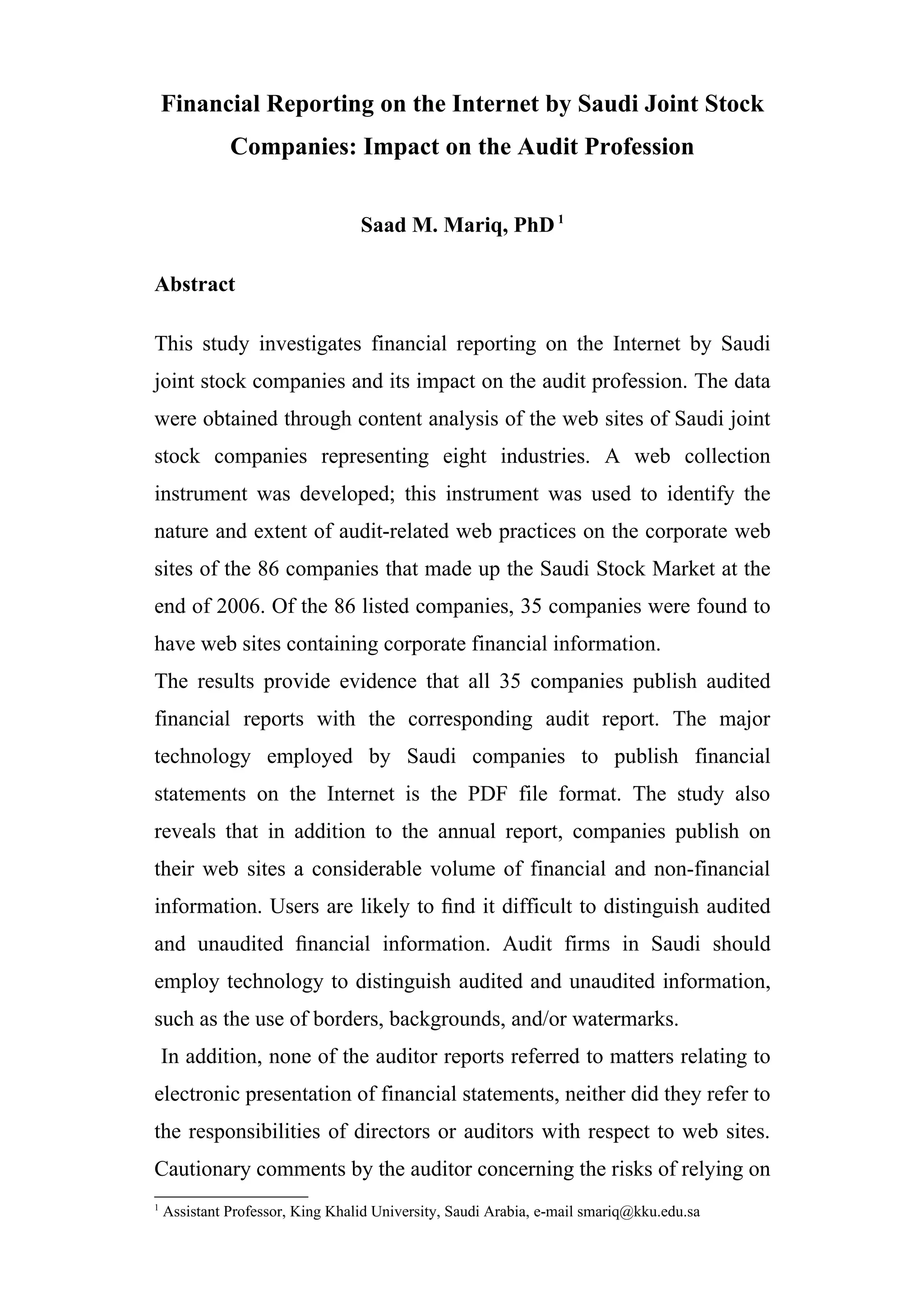 This document summarizes a study investigating financial reporting on the internet by Saudi joint stock companies and its impact on the audit profession. The study analyzed the content of websites for 86 listed Saudi companies. 35 companies were found to have websites containing financial information. All 35 published audited financial reports and the corresponding audit report. However, audited and unaudited information were not clearly distinguished. None of the audit reports referred to electronic presentation of financial statements or responsibilities regarding websites. Most audit reports were located on company websites, making it difficult for auditors to control. The study recommends Saudi professional bodies issue rules to help ensure reliability of internet financial reporting.