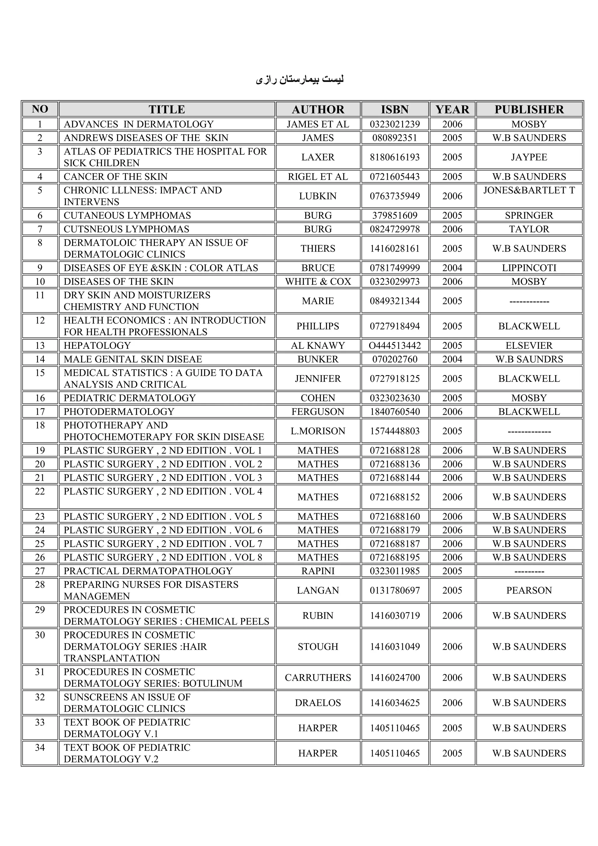 This document contains a list of 40 books related to dermatology, skin diseases, plastic surgery, and other related topics. The list includes the publisher, year of publication, ISBN number, author(s), and book title for each entry. The books cover a wide range of subjects including diseases of the skin, cancer of the skin, cutaneous lymphomas, pediatric dermatology, photodermatology, plastic surgery, procedures in cosmetic dermatology, tropical dermatopathology, and more.