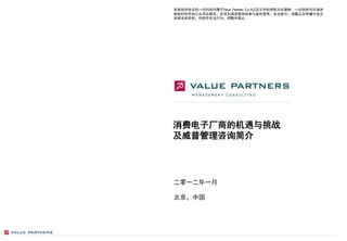 本报告由威普管理咨询提供,内容涵盖消费电子厂商的机遇与挑战。报告指出智能家庭体系是未来消费电子产业发展的关键动力,并强调了三网融合的重要性。全球消费电子市场预计在2012年将超过1万亿美元,市场竞争推动企业加速布局智能家庭市场。