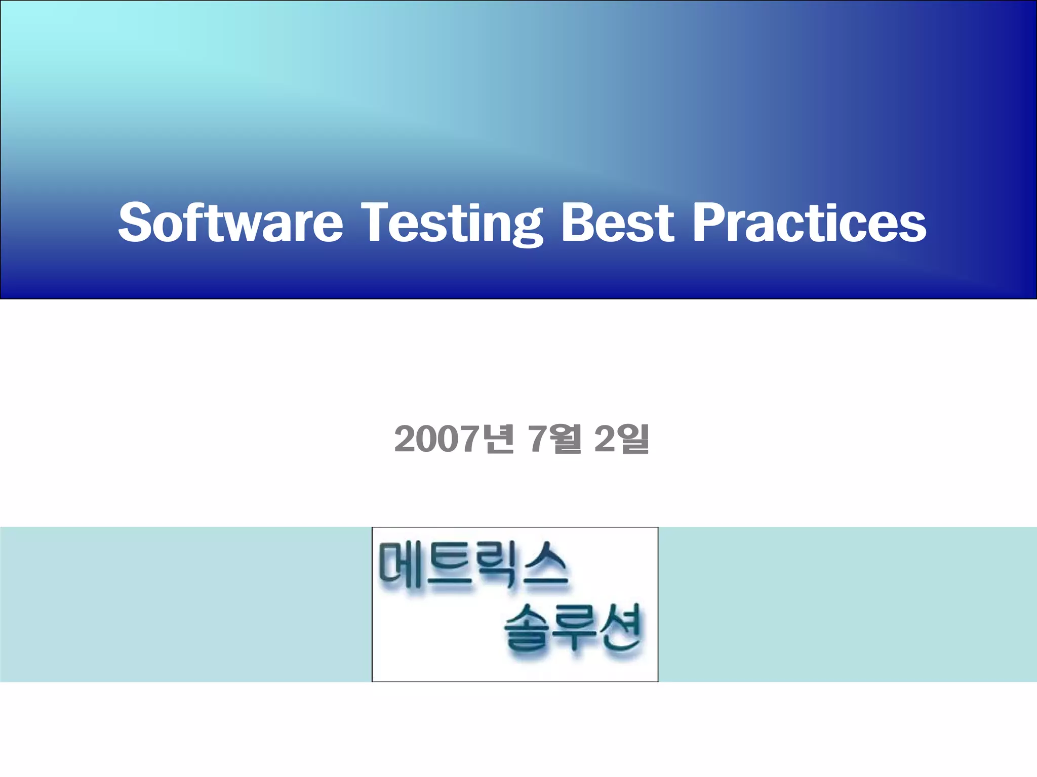The document outlines software testing best practices organized into groups: