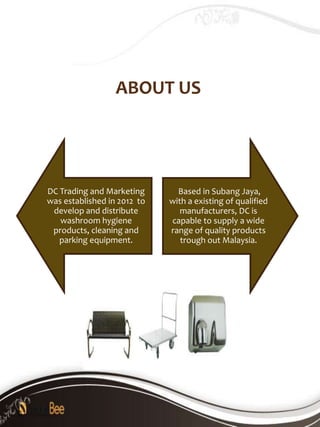 DC Trading and Marketing was established in 2012 to develop and distribute washroom hygiene products, cleaning, and parking equipment in Malaysia. The company aims to supply reliably priced, environmentally friendly products that meet clients' quality and quantity needs. Its vision is to offer a comprehensive range of washroom accessories for commercial and household use and become a respected name in the industry. DC Trading markets its wide range of products, which are detailed in 41 catalogs, to end users such as hospitals, colleges, hotels, factories, and corporate buildings.