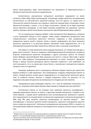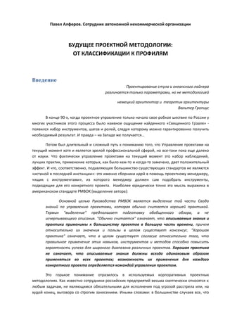 Документ описывает развитие проектного управления в российской практике, подчеркивая, что существующие методологии не являются универсальными и должны адаптироваться к конкретным проектам. Выделяется необходимость проектной классификации и адаптивной методологии, которая основывается на индивидуальных параметрах проектов для принятия решений о применяемых инструментах управления. В заключение указывается на трудности, с которыми сталкиваются организации при внедрении формализованных подходов к проектному управлению.