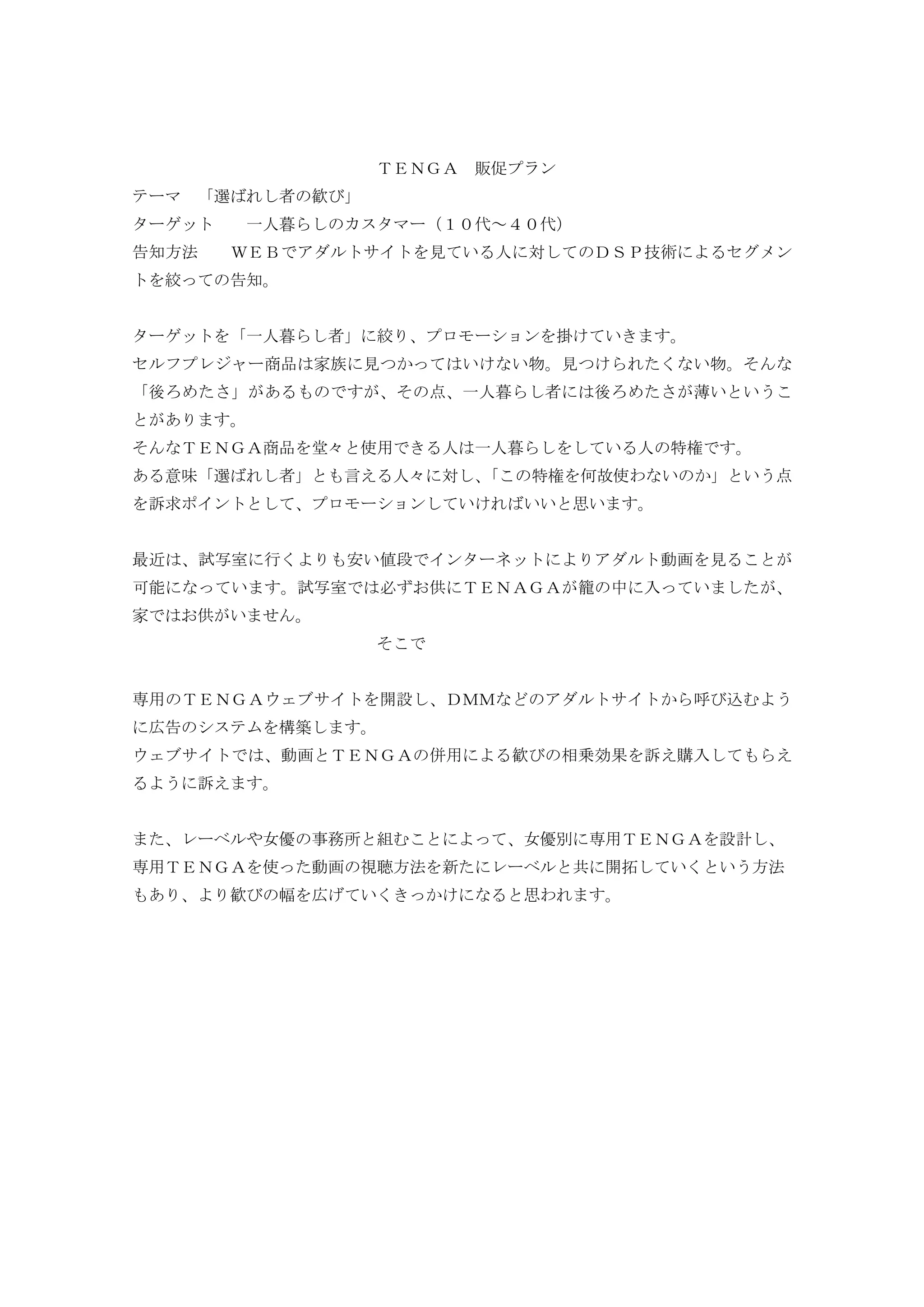 家族に見られたくないセルフプレジャーアイテム。 これを堂々と使える一人暮らしの人に対して売り込んでいきます。 最近は試写室では無く、アダルトサイトで用を手によって済ます人が多いため、そこをTENGAをお供により悦びを拡充させていく戦略です。 また女優別にTENGAやローションを開発し、プロダクションと共同開発することで、よりリアルな快楽に男性を導くことが出来、売り上げを向上させることが出来ます。