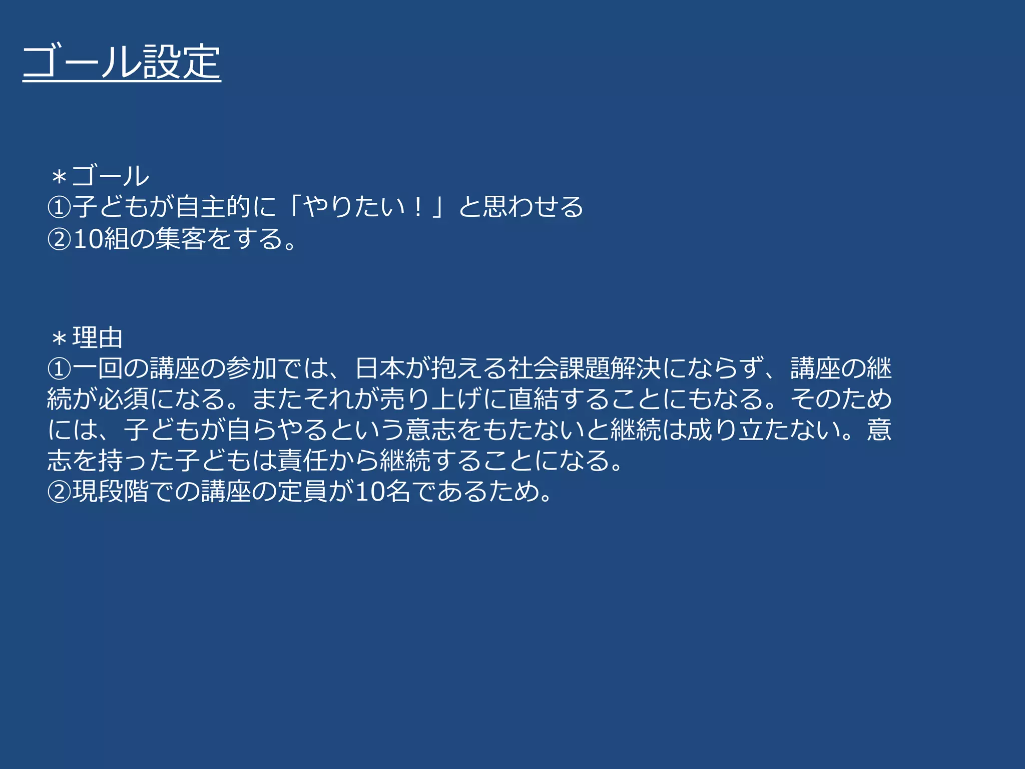 ゴール設定 *ゴール ①子どもが自主的に「やりたい!」と思わせる ②10組の集客をする。 *理由 ①一回の講座の参加では、日本が抱える社会課題解決にならず、講座の継 続が必須になる。またそれが売り上げに直結することにもなる。そのため には、子どもが自らやるという意志をもたないと継続は成り立たない。意 志を持った子どもは責任から継続することになる。 ②現段階での講座の定員が10名であるため。