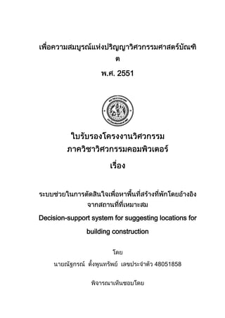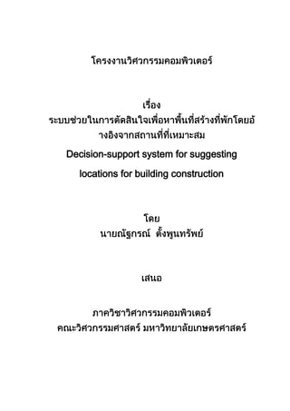 โครงงานวิศวกรรมคอมพิวเตอร์<br />เรื่องระบบช่วยในการตัดสินใจเพื่อหาพื้นที่สร้างที่พักโดยอ้างอิงจากสถานที่ที่เหมาะสมDecision-support systemfor suggesting locations for building construction<br />โดยนายณัฐกรณ์ ตั้งพูนทรัพย์<br />เสนอ<br />ภาควิชาวิศวกรรมคอมพิวเตอร์คณะวิศวกรรมศาสตร์ มหาวิทยาลัยเกษตรศาสตร์<br />เพื่อความสมบูรณ์แห่งปริญญาวิศวกรรมศาสตร์บัณฑิตพ.ศ. 2551<br />ใบรับรองโครงงานวิศวกรรมภาควิชาวิศวกรรมคอมพิวเตอร์<br />เรื่อง<br />ระบบช่วยในการตัดสินใจเพื่อหาพื้นที่สร้างที่พักโดยอ้างอิงจากสถานที่ที่เหมาะสมDecision-support system for suggesting locations for building constructionโดยนายณัฐกรณ์ ตั้งพูนทรัพย์ เลขประจำตัว 48051858พิจารณาเห็นชอบโดย<br />อาจารย์ที่ปรึกษาโครงงาน……………………………………..<br /> (รศ.ดร.กฤษณะ ไวยมัย)<br />หัวหน้าภาควิชาวิศวกรรมคอมพิวเตอร์……………………………………..<br />(ผศ.ดร. เขมะฑัต วิภาตะวนิช)<br />วันที่…...เดือน…………..พ.ศ….…<br />ณัฐกรณ์ ตั้งพูนทรัพย์ 2551: ระบบช่วยในการตัดสินใจเพื่อหาพื้นที่สร้างที่พักโดยอ้างอิงจากสถานที่ที่เหมาะสม, โครงงานวิศวกรรมคอมพิวเตอร์ ปริญญาวิศวกรรมศาสตร์บัณฑิต (วิศวกรรมคอมพิวเตอร์) ที่ปรึกษาโครงงาน: รศ.ดร.กฤษณะ ไวยมัย<br />บทคัดย่อ<br />ในชีวิตของคนในปัจจุบัน จำเป็นที่จะต้องมีที่อยู่อาศัย ทำให้คนเราต้องหาทำเลที่เหมาะสมสำหรับใช้เป็นที่พัก จึงกลายมาเป็นปัญหาที่ว่า เราควรจะสร้างที่พักบริเวณใดจึงจะดึงดูดความสนใจให้คนมาพักได้มากที่สุด สำหรับผู้ประกอบการบางส่วนที่ต้องการสร้างที่พัก อาทิเช่น หอพัก อพาร์ตเมนท์ เป็นต้น อาจจะเคยมีความคิดประการหนึ่งว่า หากสามารถหาพื้นที่ที่มีความสมบูรณ์พร้อมในด้านต่างๆ อาทิเช่น ความปลอดภัย การศึกษา เป็นต้น ก็น่าจะสามารถดึงดูดให้ผู้คนมาเช่าหรือมาพักได้มาก จึงน่าจะมีบางสิ่งบางอย่างที่นำมาช่วยวิเคราะห์ได้ว่าพื้นที่บริเวณใดถ้านำไปสร้างที่พักแล้วจะมีโอกาสประสบความสำเร็จสูง จึงนำปัญหามาวิเคราะห์โดยอาศัยเทคนิคของการทำเหมืองข้อมูล (Data Mining) โดยการนำข้อมูลเชิงแผนที่และเชิงจำนวนที่เป็นข้อมูลคุณภาพชีวิต มาทำการวิเคราะห์โดยแบ่งกลุ่มข้อมูลออกเป็นหลายๆกลุ่ม โดยจะอนุมานว่าพื้นที่รอบๆกลุ่มสถานที่ที่ดีที่สุดจะถือว่าเป็นพื้นที่ที่มีอัตราประสบความสำเร็จในการสร้างที่พักสูงที่สุด และใช้กูเกิลแม็พเพื่อแสดงพื้นที่ที่เหมาะสมสำหรับสร้างที่พักระบบช่วยในการตัดสินใจเพื่อหาพื้นที่สร้างที่พักโดยอ้างอิงจากสถานที่ที่เหมาะสมจะช่วยเป็นเครื่องมือช่วยในการตัดสินใจได้ในระดับหนึ่งว่า หากต้องการสร้างที่พักในลักษณะที่ผู้ใช้ต้องการแล้ว ควรจะเลือกสร้างที่พักบนพื้นที่บริเ