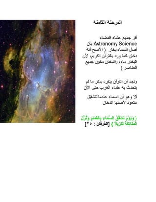 الوثيقة تناقش مفهوم الكرسي والعرش في السياق الكوني والجيولوجي، حيث توضح التركيب الطبقي للأرض وطبقات السماء. تُشير إلى أن هناك سبع أراضٍ وسبع سماوات، كما تستعرض الخصائص المختلفة لكل منها. كما يتم الإشارة إلى أن الكواكب الأخرى قد تكون موجودة بناءً على الفهم الجيولوجي والديني.