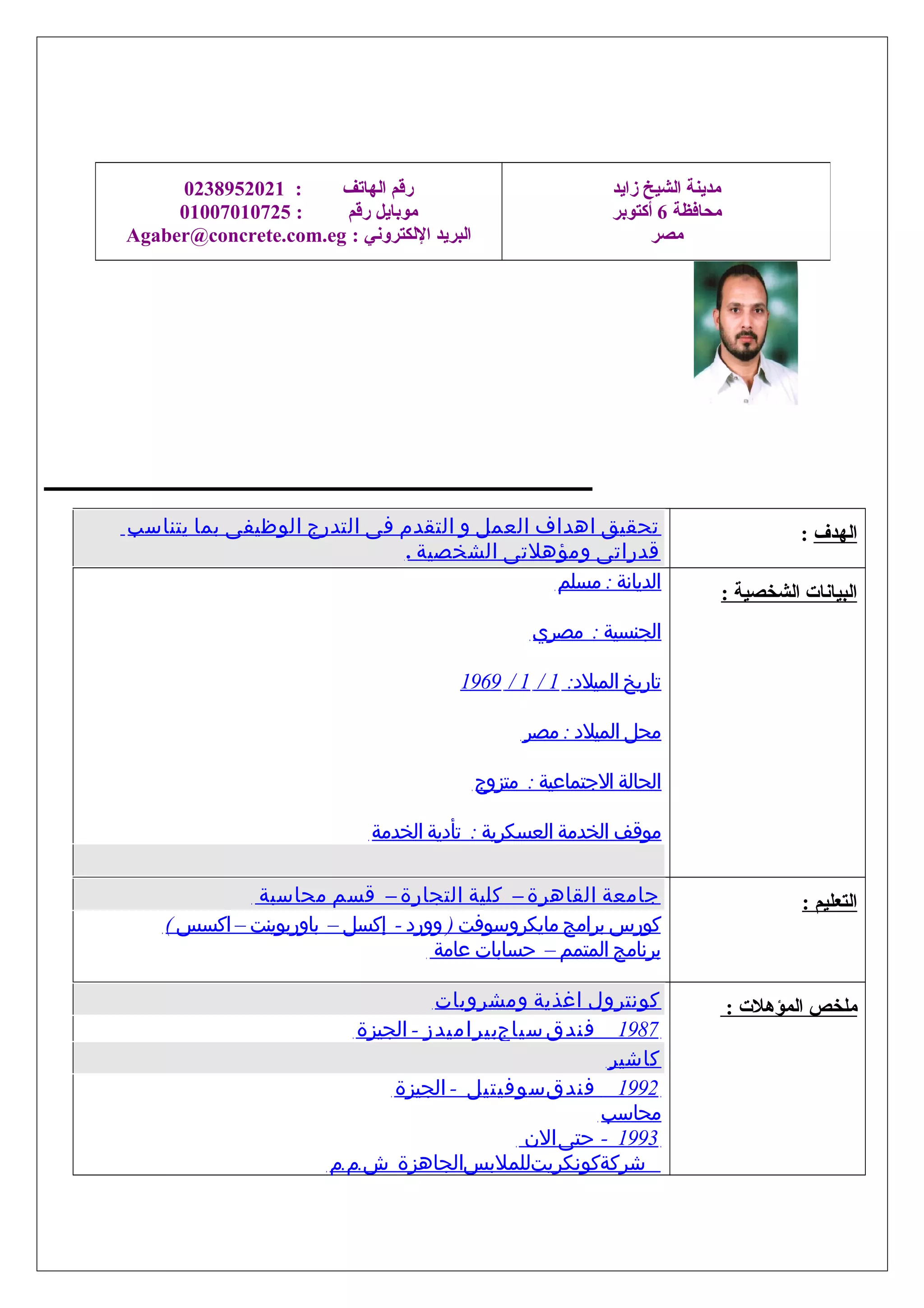 الشخص يبلغ من العمر 54 عامًا، مصري الديانة والجنسية، ويعمل حاليًا محاسبًا رئيسيًا في شركة كونكريت للملابس الجاهزة. يمتلك خبرة في إعداد الحسابات المالية والتقارير السنوية والميزانيات، ويتحدث العربية والإنجليزية بمستوى جيد. حصل على شهادة محاسبة من جامعة القاهرة ولديه مهارات في استخدام برامج مايكروسوفت أوفيس.