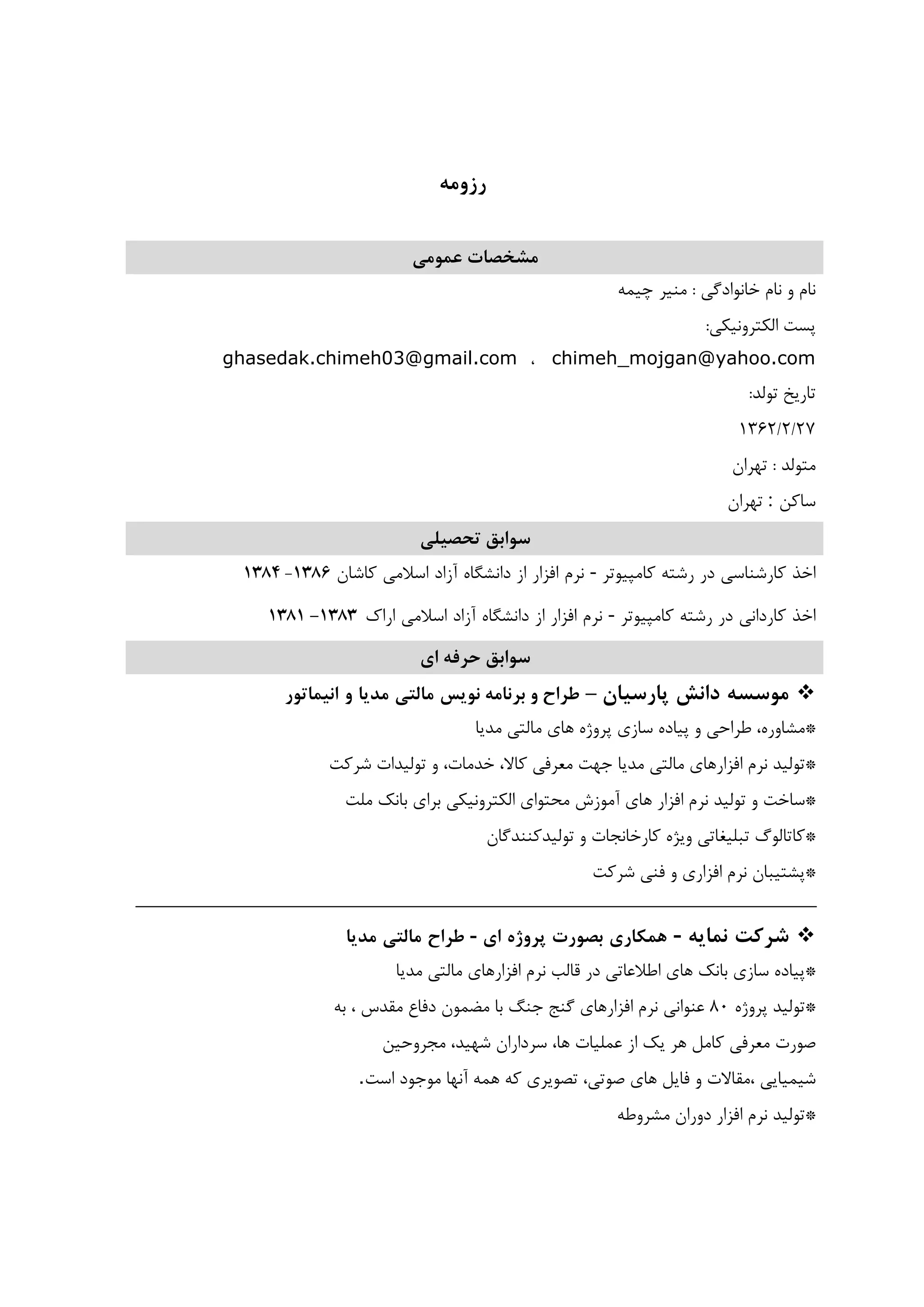 و ﻧﺎم:ﻣﻨﻴﺮﭼﻴﻤﻪ ﭘﺴﺖاﻟﻜﺘﺮوﻧﻴﻜﻲ: chimeh_mojgan@yahoo.com،ghasedak.chimeh03@gmail.com ﺗﺎرﻳﺦﺗﻮﻟﺪ: 27/2/1362 ﻣﺘﻮﻟﺪ:ﺗﻬﺮان ﺳﺎﻛﻦ:ﺗﻬﺮان ﺗﺤﺼﻴﻠﻲ ﺳﻮاﺑﻖ اﺧﺬﻛﺎرﺷﻨﺎﺳﻲدررﺷﺘﻪﻛﺎﻣﭙﻴﻮﺗﺮ-ﻧﺮماﻓﺰارازداﻧﺸﮕﺎهآزاداﺳﻼﻣﻲﻛﺎﺷﺎن1386-1384 اﺧﺬﻛﺎرداﻧﻲدررﺷﺘﻪﻛﺎﻣﭙﻴﻮﺗﺮ-ﻧﺮماﻓﺰارازداﻧﺸﮕﺎهآزاداﺳﻼﻣﻲاراك1381 -1383 اي ﺣﺮﻓﻪ ﺳﻮاﺑﻖ ﻣﻮﺳﺴﻪداﻧﺶﭘﺎرﺳﻴﺎن–ﻃﺮاحﻧﻮﻳﺲ ﺑﺮﻧﺎﻣﻪ وﻣﺎﻟﺘﻲﻣﺪﻳﺎواﻧﻴﻤﺎﺗﻮر *،ﻣﺸﺎورهﻃﺮاﺣﻲوﭘﻴﺎدهﺳﺎزيﭘﺮوژهﻫﺎيﻣﺎﻟﺘﻲﻣﺪﻳﺎ *ﺗﻮﻟﻴﺪﻧﺮماﻓﺰارﻫﺎيﻣﺎﻟﺘﻲﻣﺪﻳﺎﺟﻬﺖﻣﻌﺮﻓﻲ،ﻛﺎﻻ،ﺧﺪﻣﺎتوﺗﻮﻟﻴﺪاتﺷﺮﻛﺖ *ﺳﺎﺧﺖوﺗﻮﻟﻴﺪﻧﺮماﻓﺰارﻫﺎيآﻣﻮزشﻣﺤﺘﻮاياﻟﻜﺘﺮوﻧﻴﻜﻲﺑﺮايﺑﺎﻧﻚﻣﻠﺖ *ﻛﺎﺗﺎﻟﻮگﺗﺒﻠﻴﻐﺎﺗﻲوﻳﮋهﻛﺎرﺧﺎﻧﺠﺎتوﺗﻮﻟﻴﺪﻛﻨﻨﺪﮔﺎن *ﭘﺸﺘﻴﺒﺎنﻧﺮماﻓﺰاريوﻓﻨﻲﺷﺮﻛﺖ ﺷﺮﻛﺖﻧﻤﺎﻳﻪ-ﻫﻤﻜﺎريﺑﺼﻮرتﭘﺮوژهاي-ﻃﺮاحﻣﺎﻟﺘﻲﻣﺪﻳﺎ *ﭘﻴﺎدهﺳﺎزيﺑﺎﻧﻚﻫﺎياﻃﻼﻋﺎﺗﻲدرﻗﺎﻟﺐﻧﺮماﻓﺰارﻫﺎيﻣﺎﻟﺘﻲﻣﺪﻳﺎ *ﺗﻮﻟﻴﺪﭘﺮوژه80ﻋﻨﻮاﻧﻲﻧﺮماﻓﺰارﻫﺎيﮔﻨﺞﺟﻨﮓﺑﺎﻣﻀﻤﻮندﻓﺎعﻣﻘﺪس،ﺑﻪ ﺻﻮرتﻣﻌﺮﻓﻲﻛﺎﻣﻞﻫﺮﻳﻚازﻋﻤﻠﻴﺎت،ﻫﺎﺳﺮداران،ﺷﻬﻴﺪﻣﺠﺮوﺣﻴﻦ ﺷﻴﻤﻴﺎﻳﻲ،ﻣﻘﺎﻻتوﻓﺎﻳﻞﻫﺎي،ﺻﻮﺗﻲﺗﺼﻮﻳﺮيﻛﻪﻫﻤﻪآﻧﻬﺎﻣﻮﺟﻮداﺳﺖ. *ﺗﻮﻟﻴﺪﻧﺮماﻓﺰاردورانﻣﺸﺮوﻃﻪ