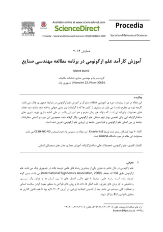 Sciences Available online at www.sciencedirect.com Procedia – Social and Behavioral Sciences 174(2015)3204-3209 همایش4102 علم کارآمد آموزشصنایع مهندسی مطالعه برنامه در ارگونومی 0 Marek Bures ،مکانیک دانشکده ،صنایع مهندسی و مدیریت گروه Univezitni 22, Pilsen 30614,چک جمهوری :چکیده .باشد می ،چک جمهوری شرایط در ارگونومی علم آموزش بر متمرکز خالقانه آموزشی ی دوره پیشرفت مورد در مقاله این باشند شده ساخته جهانی بنایی زیر گرایشات با که ها کشور از بسیاری در توان می را شده مطرح ی دوره اگرچهه .دیددف و مفرح زمان هم بتواند که است ای نوآورانه محتویات خلقهمهای تئوری ،دوره سازی آماده طی در .باشد آموزشی علم مسائل فهم بهتر تضمین برای ایی ساختارگرایانهشد گرفته بکار ،ارگونومیهسفارشات اساس بر دوره این همچنین . ی جامعه فدراسیون و ارگونومی علم المللی بین ی جامعه.است شده تدوین ،ارگونومی علم اروپایی ©4102توسط شده منشر .کنندگان تهیهElsevier Ltdلیسانس تحت عام دسترس در مقاله این .CC BY-NC-ND.باشد می دانشگاه حوزه در مقاله این مسئولیتSakarya.است انسانی دیجیتالی های مدل ،مجازی آموزش ،ساختارگرایانه ،عالی تحصیالت ،ارگونومی علم :کلیدی کلمات 1.معرفی .باشد می چک جمهوری در یافته توسعه علمی های رشته بیشترین از یکی عنوان به حاضر حال در ارگونومی علمعلم طبق ارگونومیIEAمخفف که(International Ergonomics Association, 2000)گونه بدین ،باشد می ،سیستم یک عوامل و ها انسان بین ما های العمل عکس فهم با مرتبط علمی رشته :است شده تعریف من به طراحی های روش و ها داده ،ها العلل علت ،تئوری های بردن کار به تخصص وانسانی سالمت کردن بهینه ظور سیستم کلی عملکرد وتاسیس از بعد .باشد میآوریل در اروپایی اتحادیه4112ها گذاری قانون همه تا بود الزم ، قوانین با مطابقEU.شوند سازگار 1 +:تلفن .نویسنده با مکاتبه های راه024-131-717171+ :فاکس ،024-311-037044 :رایانامهburesm@kpv.zcu.cz