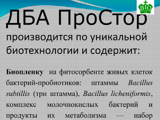 Документ описывает биотехнологию ООО "Научно-технический центр биологических технологий в сельском хозяйстве" и результаты испытаний добавки ДБА "Простор" для различных сельскохозяйственных животных и птиц. Применение этой добавки привело к снижению затрат корма, повышению привесов и улучшению биоэффективности на нескольких хозяйствах. Также рассматривается влияние на продуктивность рыб и улиток, а также сокращение использования антибиотиков.