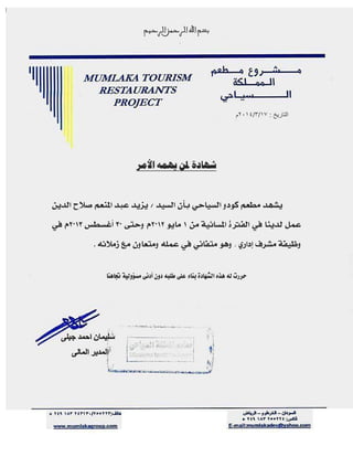 تشير الشهادة إلى أن صالح العم عبد يسيد قد عمل في مطعم كودو السياحي كإداري مشرف بين مايو 2012 وأغسطس 2013، حيث أظهر تفانياً في العمل والتعاون مع الزملاء. تؤكد الشهادة على بذل الجهود والمسؤوليات التي قام بها خلال فترة عمله.