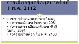 พ . ศ . 2112 การขยายอำนาจของราชวงศ์ตองอู สงครามสมัยพระไชยราชา 2081 สงครามคราวเสียสมเด็จพระศรีสุริโยทัย 2091 สงครามช้างเผือก ใน พ . ศ . 2106