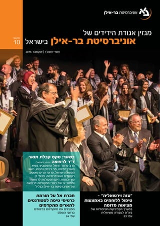 של הידידים אגודת מגזין 2 בישראל בר-אילן אוניברסיטת של הידידים אגודת יו"ר דבר יונס אלי מר ,היקרים הידידים אגודת חברי של הידידים אגודת מגזין של 10 מספר גיליון ,זה ומיוחד חגיגי גיליון לכם להגיש שמח אני השנה פעילותנו במרכז .האגודה פעילות של שנה המסכם ,בישראל בר-אילן אוניברסיטת אישי של רחב לקהל וחשיפתו בר-אילן אוניברסיטת של הסגולי הערך הבלטת עמדה בעשייה ,במחקר האוניברסיטה תרומת של בייחודה דגש שימת מתוך ,עסקים ואנשי ציבור .בישראל הציבורי השיח במרכז העומדים ובנושאים חברתית מפגשי עומדים בשיאה אשר ,ענפה פעילות באמצעות זאת עשתה בישראל הידידים אגודת לדמויות הבמה את פתחנו שהתקיימו המגוונים המפגשים בחמשת ."בר-אילן "פורום :והכלכליים הצבאיים מהתחומים בכירות לדמויות וכן הפוליטית הקשת קצוות מכל מובילות -המדיני הקבינט וחבר האוצר שר לשעבר ,"עתיד "יש מפלגת יו"ר - לפיד יאיר חה"כ השר - אלקין זאב השר ;צה"ל של 20-ה הרמטכ"ל ,גנץ )(בני בנימין 'במיל רא"ל ;ביטחוני Start-Up Nation מנכ"ל - קנדל יוג'ין 'פרופ ;ולמורשת לירושלים והשר הסביבה להגנת אלו אישים .לשעבר והרמטכ"ל הביטחון שר - יעלון )(בוגי משה )'(במיל ורא"ל ;Central ;בר-אילן בקמפוס דבריהם את לשמוע שהגיעו השפעה בעלי עסקים אנשי לפני נאמו בהרחבה שעסקה ,התקשורת באמצעות כולו הישראלי הציבור אל הגיעו הדברים וכותרות ."בר-אילן "פורום בימת מעל בנאמר שנת ,חדשה אקדמית לימודים ושנת חדשה עברית שנה של בפתיחתה עתה עומדים אנו ליבה בסוגיות שיעסקו מעניינים ובמפגשים מגוונת בפעילות תאופיין היא שגם ,תשע"ז .בפניהם ניצבות העסקית והזירה הישראלית שהחברה ובאתגרים לקהלים בר-אילן אוניברסיטת לחשיפת שנעשתה מפעילות להתרשם תוכלו זה בגיליון במעבדות ביקרו והנהלות בכירים ,האוניברסיטה בקמפוס שנערכו ומביקורים חדשים המהווים ,החשובים הפעולה לשיתופי ראשונים זרעים וזרעו ייחודיים ובמיזמים נבחרות טעימה .בר-אילן באוניברסיטת המתבצעת והחברתית האקדמית ,המחקרית לפעילות בסיס לקרוא תוכלו ,היתר בין .אלו בדפים משולבת שהבשילו פעולה שיתופי של מתוצרים השקעות בית בחסות ,"המנטור "תכנית ,רופאים להכשרת הייחודית ההוראה תכנית על לעבודה הספר בבית לטיפול הקליניקות על ;בנין-בר רוני והפילנתרופית שחם אלטשולר לחיילים חדשני טיפול וכן מוחלשות לאוכלוסיות מסובסד טיפול מעניקות אשר ,סוציאלית וטיפול אבחון שירותי ועל ;בצה"ל הרפואה חיל בשיתוף מיזם ,מפוסט-טראומה הסובלים לחולי המסייעים ,לרפואה בפקולטה גנומית אישית לרפואה המעבדה שנותנת ,בסרטן אישי .ועוד זאת כל - שפיר דב 'במיל אל"מ של תרומתו בסיוע הארץ רחבי בכל סרטן .הקריאה מן ותיהנו הרבה העשייה מן שתתרשמו מקווה אני ,שמח חג בברכת יונס אלי הידידים אגודת יו"ר