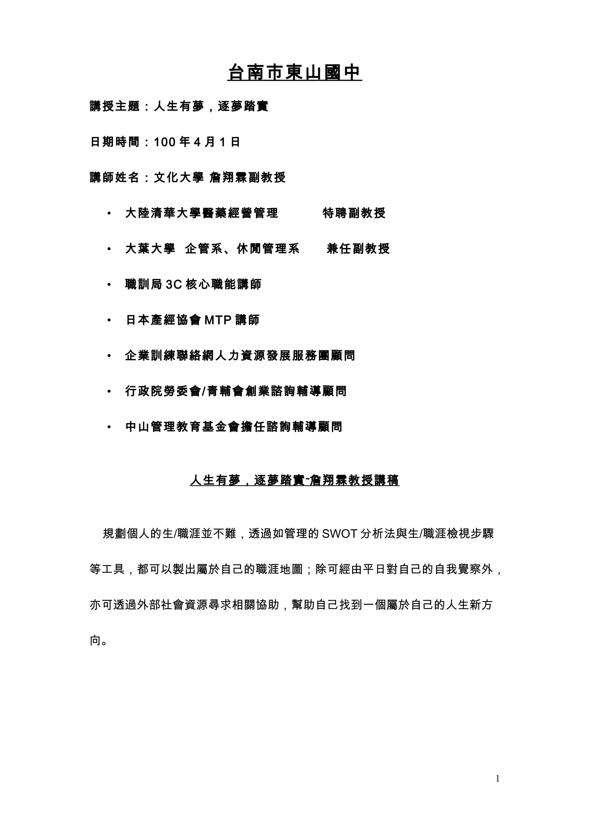 詹翔霖教授在台南市東山國中講授職涯規劃的重要性,提出四個規劃步驟:自我探索、訂定未來目標、抉擇與決定、執行行動方案。教授強調自我覺察與外部資源的利用,有助於學生找到適合自己的職涯方向。演講中也鼓勵學子發展個人能力,成為有用且受尊敬的人。