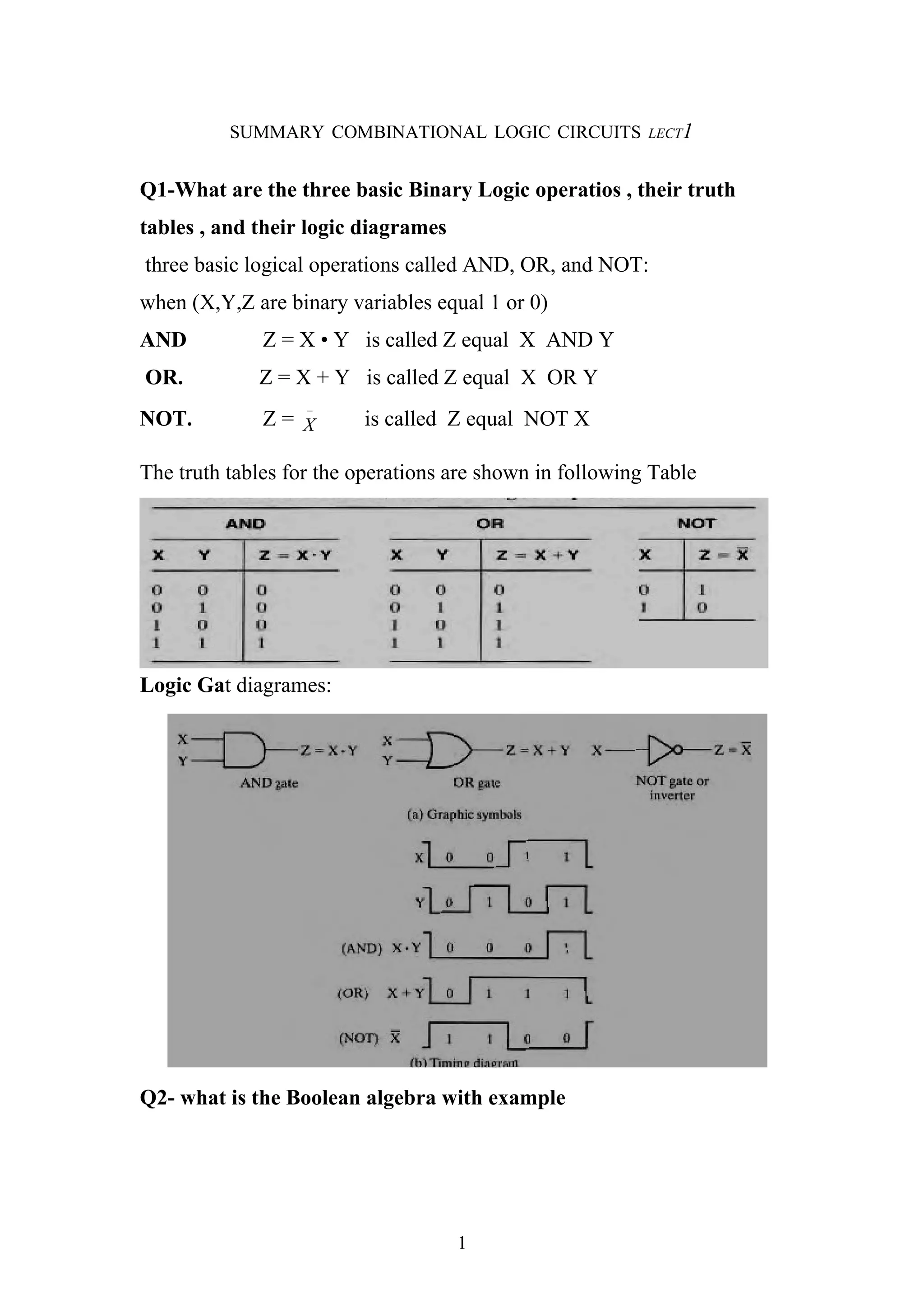 1. The three basic logic operations - AND, OR, NOT - and their truth tables and logic diagrams.