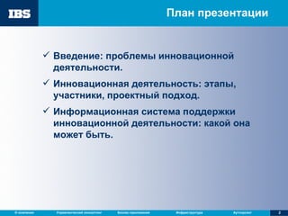 Документ описывает этапы и участники инновационной деятельности, а также системы и методы поддержки этого процесса в компании IBS. В нем приведены ключевые факторы успеха и препятствия для реализации инновационных проектов, а также подробно раскрыты стадии, начиная от идеи и до внедрения продукта. Также рассматриваются преимущества использования информационных систем для повышения эффективности и снижения затрат на инновационные программы.