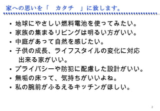 家への思いを「 カタチ 」に致します。 地球にやさしい燃料電池を使ってみたい。 家族の集まるリビングは明るい方がいい。