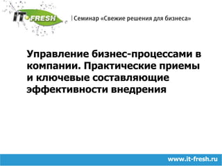 Документ описывает управление бизнес-процессами в компании и ключевые инструменты для улучшения их эффективности. Основное внимание уделяется регламентации, технологиям управления цепочками работ и представлению показателей в режиме реального времени. Также подчеркивается важность быстрого доступа к необходимой информации и документам для топ-менеджеров и сотрудников.