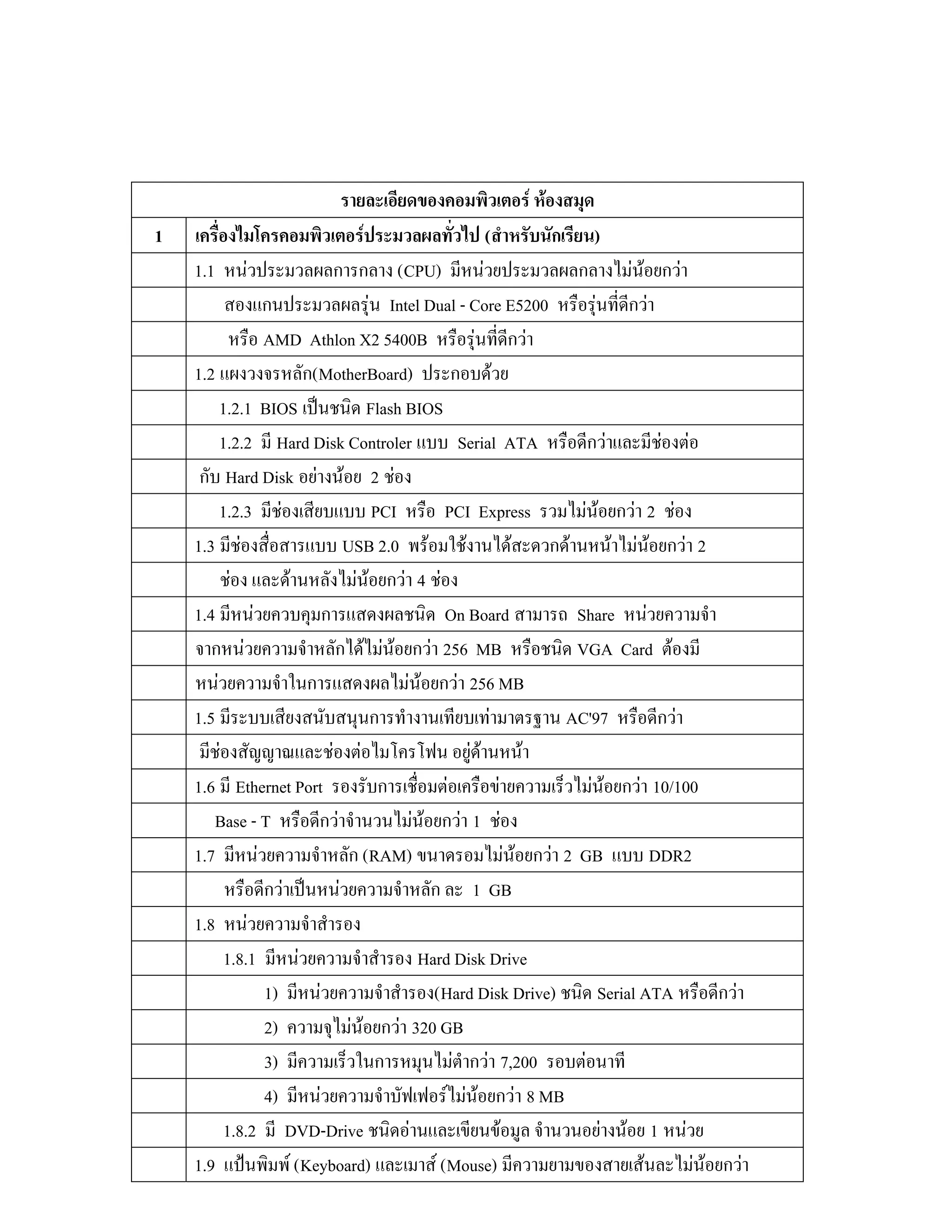 เครื่องไมโครคอมพิวเตอรประมวลผลทั่วไป (สําหรับนักเรียน) 1.1 หนวประมวลผลการกลาง (CPU) มีหนวยประมวลผลกลางไมนอยกวา สองแกนประมวลผลรุน Intel Dual - Core E5200 หรือรุนที่ดีกวา หรือ AMD Athlon X2 5400B หรือรุนที่ดีกวา 1.2 แผงวงจรหลัก(MotherBoard) ประกอบดวย 1.2.1 BIOS เปนชนิด Flash BIOS 1.2.2 มี Hard Disk Controler แบบ Serial ATA หรือดีกวาและมีชองตอ กับ Hard Disk อยางนอย 2 ชอง 1.2.3 มีชองเสียบแบบ PCI หรือ PCI Express รวมไมนอยกวา 2 ชอง 1.3 มีชองสื่อสารแบบ USB 2.0 พรอมใชงานไดสะดวกดานหนาไมนอยกวา 2 ชอง และดานหลังไมนอยกวา 4 ชอง 1.4 มีหนวยควบคุมการแสดงผลชนิด On Board สามารถ Share หนวยความจํา จากหนวยความจําหลักไดไมนอยกวา 256 MB หรือชนิด VGA Card ตองมี หนวยความจําในการแสดงผลไมนอยกวา 256 MB 1.5 มีระบบเสียงสนับสนุนการทํางานเทียบเทามาตรฐาน AC'97 หรือดีกวา มีชองสัญญาณและชองตอไมโครโฟน อยูดานหนา 1.6 มี Ethernet Port รองรับการเชื่อมตอเครือขายความเร็วไมนอยกวา 10/100 Base - T หรือดีกวาจํานวนไมนอยกวา 1 ชอง 1.7 มีหนวยความจําหลัก (RAM) ขนาดรอมไมนอยกวา 2 GB แบบ DDR2 หรือดีกวาเปนหนวยความจําหลัก ละ 1 GB 1.8 หนวยความจําสํารอง 1.8.1 มีหนวยความจําสํารอง Hard Disk Drive 1) มีหนวยความจําสํารอง(Hard Disk Drive) ชนิด Serial ATA หรือดีกวา 2) ความจุไมนอยกวา 320 GB 3) มีความเร็วในการหมุนไมตํากวา 7,200 รอบตอนาที 4) มีหนวยความจําบัฟเฟอรไมนอยกวา 8 MB 1.8.2 มี DVD-Drive ชนิดอานและเขียนขอมูล จํานวนอยางนอย 1 หนวย 1.9 แปนพิมพ (Keyboard) และเมาส (Mouse) มีความยามของสายเสนละไมนอยกวา