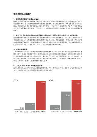 The document shows a bar graph comparing the click-through rate (CTR) and conversion rate (CVR) for LinkAd Beta versus the standard product. LinkAd Beta has a much higher CTR at 7.95% compared to 1.86% for the standard product, but a lower CVR of 0.26% versus 0.16% for the standard product.
