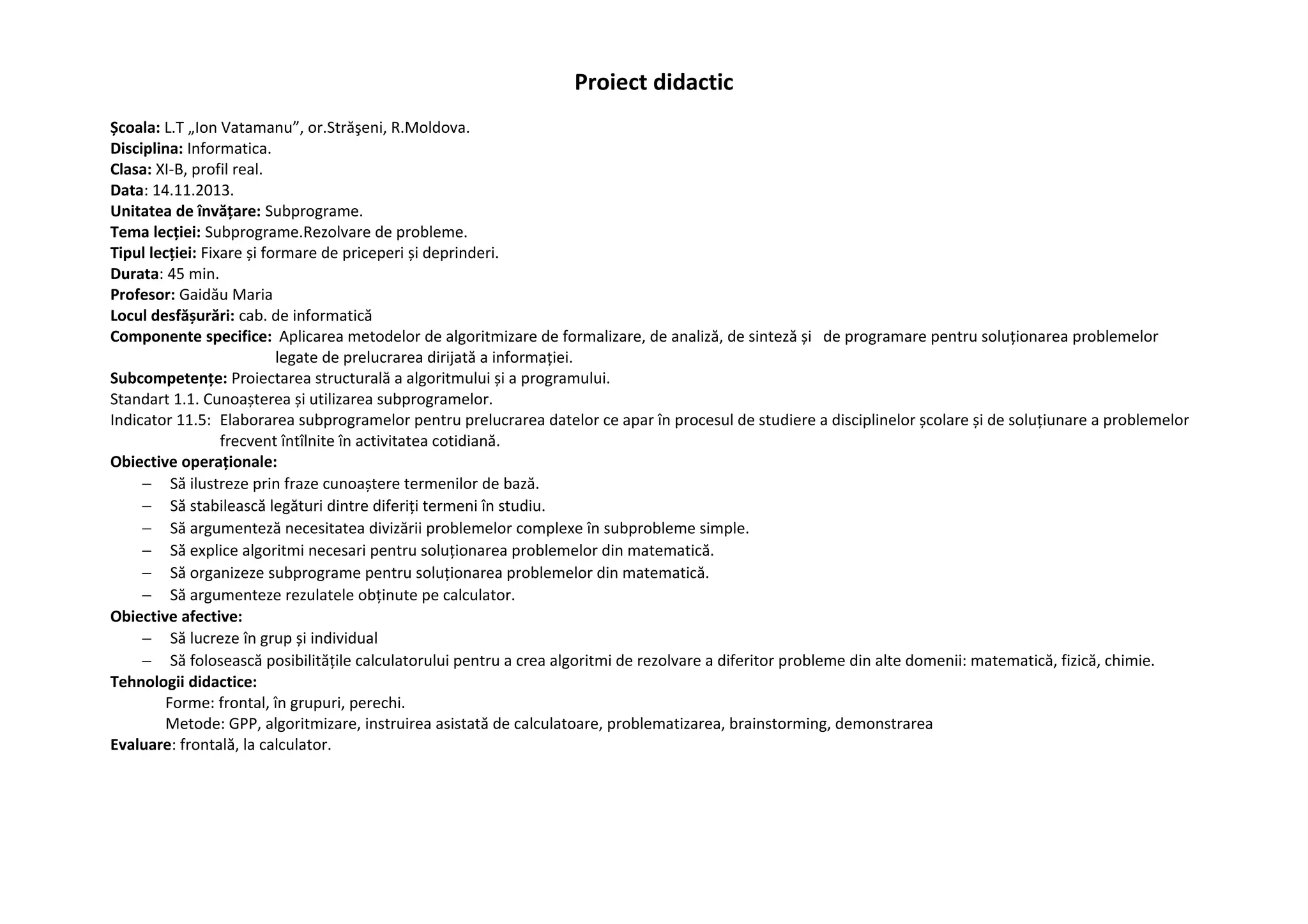 Documentul detaliază un proiect didactic pentru clasa XI-B, disciplina informatică, axat pe învățarea subprogramelor și algoritmilor pentru rezolvarea problemelor matematice. Obiectivele operaționale includ ilustrarea conceptelor cheie, divizarea problemelor complexe și argumentarea soluțiilor obținute pe calculator, cu activități variate precum jocuri de rol și evaluări asistate de calculator. Lecția se desfășoară pe parcursul a 45 de minute, cu scopul de a dezvolta abilități de lucru individual și în echipă, folosind tehnologia informatică.