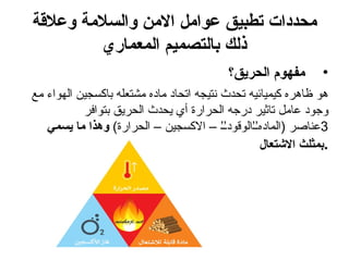 يتناول المستند مفهوم الحرائق وأسبابها، مع توضيح العناصر الأساسية اللازمة للاشتعال، وهي الحرارة والأكسجين والمادة المشتعلة. يتم استعراض أهمية التصميم المعماري في منع الحرائق، من خلال تطبيق محددات تساهم في تعزيز السلامة والأمن، مثل استخدام مواد مقاومة للحريق وتوفير أنظمة إنذار فعال. كما يناقش المستند استراتيجيات مختلفة لإطفاء الحرائق مثل استخدام المياه والرغاوي، وتعزيز كفاءة التصميم لضمان سرعة إخلاء المباني خلال حالات الطوارئ.