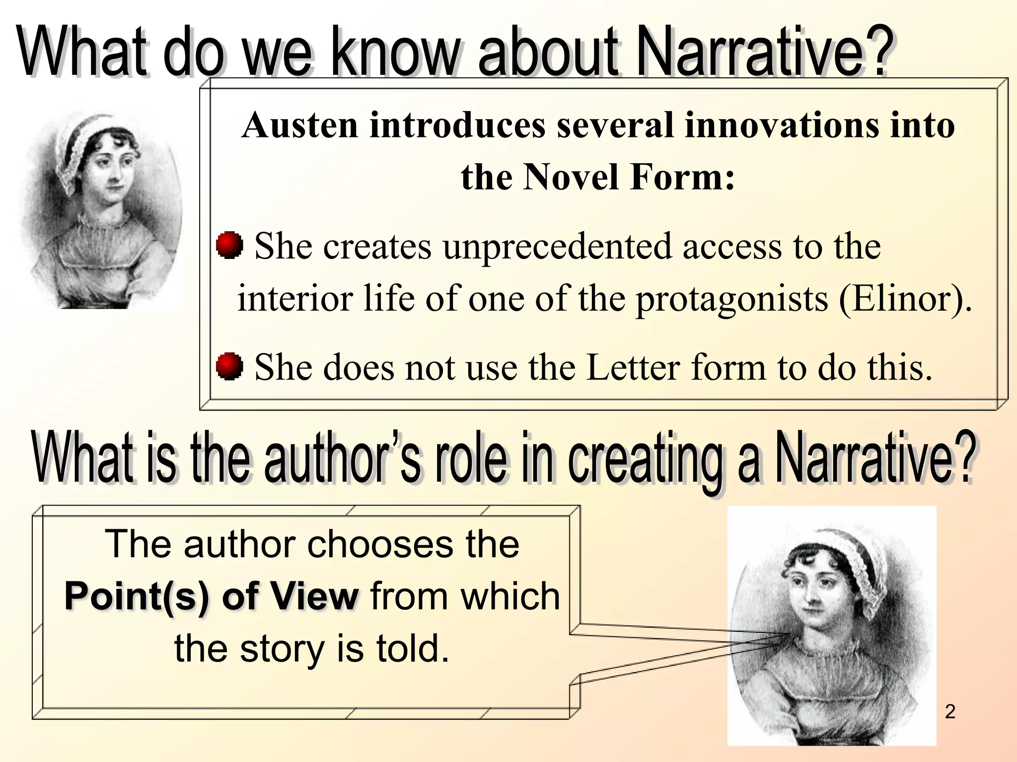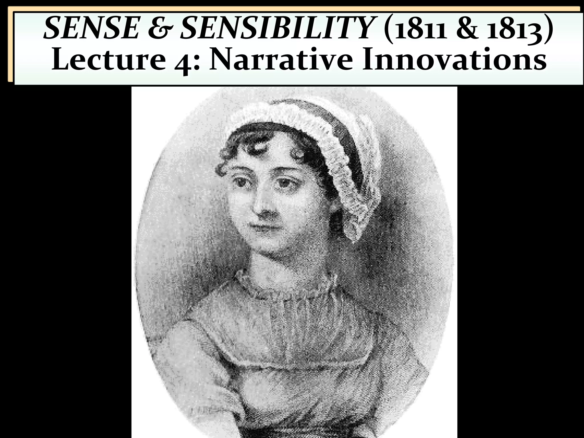 Elinor introduces several narrative innovations in Sense and Sensibility, including unprecedented access into the thoughts of one of the protagonists, Elinor, through the use of an unnamed third-person omniscient narrator. The narrator chooses to tell the story primarily from Elinor's point of view through techniques like free indirect discourse and focalization. Austen also uses irony, conveying meanings that differ from what is literally said, to expose misrepresentations and concealments of truth regarding characters' statements and emotions.