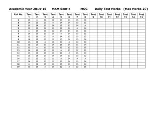 The document contains internal marks data for two academic terms - MAM Semester 3 and MAM Sem-4. For Semester 3, it lists the roll numbers of 19 students, their internal marks out of 50 and out of 30. For Sem-4, it provides the daily test marks for 19 students across 10 tests, with marks ranging from 11 to 16 out of a maximum of 20.