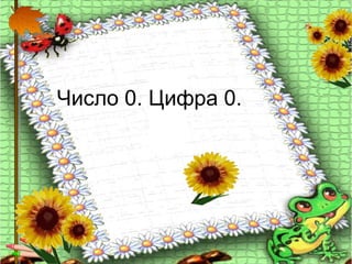 Документ представляет собой учебный материал, посвященный числу 0 и его количественным свойствам. Он включает в себя задания на сложение и вычитание, а также задачи с подсчетом предметов. Основное внимание уделяется тому, как воспринимается цифра 0 и её использование в математических примерах.