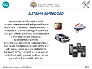 Il documento esplora i sistemi embedded, concentrandosi su Arduino come esempio pratico, evidenziando l'importanza dei microcontrollori in dispositivi quotidiani. Mette in luce la filosofia di prototipazione di Arduino e la comunità collaborativa che la sostiene, enfatizzando il riutilizzo della tecnologia esistente e la semplicità di utilizzo. Infine, descrive come Arduino funzioni come una piattaforma per creare progetti interattivi tramite un linguaggio di programmazione semplice.