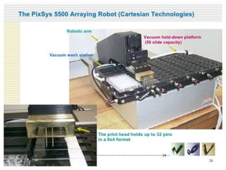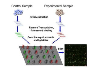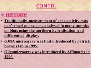 The document explains DNA microarray technology for genome analysis, detailing its principles, types (cDNA and oligonucleotide microarrays), and experimental procedures. It highlights the applications of DNA chips in gene expression profiling, drug discovery, and diagnostics, while also mentioning their advantages and disadvantages, such as cost and complexity in data analysis. Overall, DNA microarrays enable the simultaneous analysis of thousands of genes, contributing to advancements in medical research.