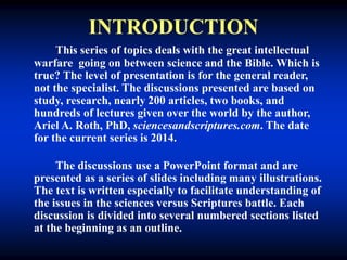 This document introduces a series of discussions about the debate between creation and evolution from a scientific perspective. It provides an overview of the 17 main discussions to be presented, which cover topics like the origin of life, complexity, fossils, the Genesis Flood, and challenges to evolutionary theory. Each discussion will include an outline, illustrations, questions and answers to facilitate understanding. The goal is to objectively examine the evidence and issues in the ongoing controversy between science and the Bible from the perspective of creation science.