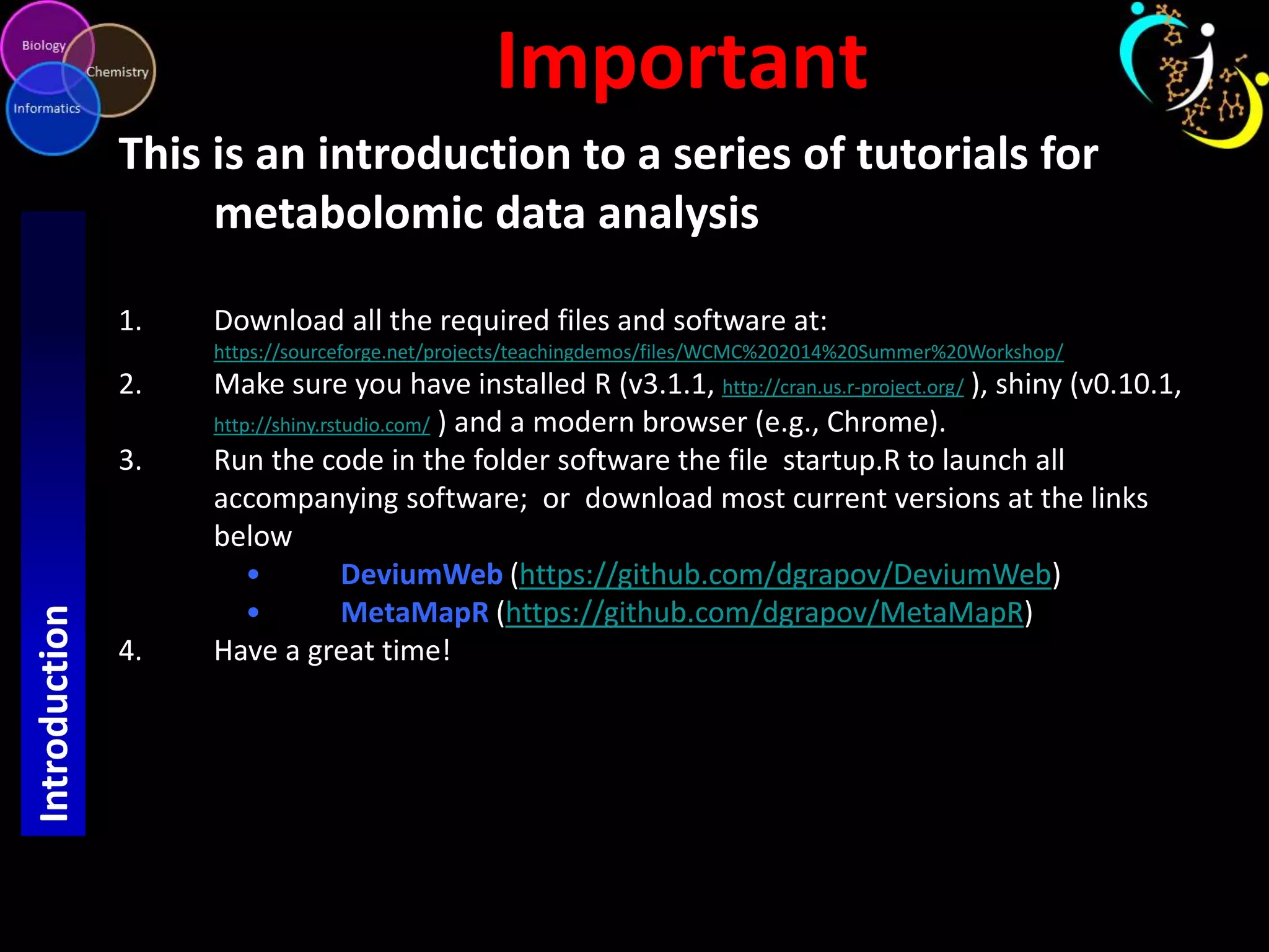 This document provides an introduction and overview of tutorials for metabolomic data analysis. It discusses downloading required files and software. The goals of the analysis include using statistical and multivariate analyses to identify differences between sample groups and impacted biochemical domains. It also discusses various data analysis techniques including data quality assessment, univariate and multivariate statistical analyses, clustering, principal component analysis, partial least squares modeling, functional enrichment analysis, and network mapping.