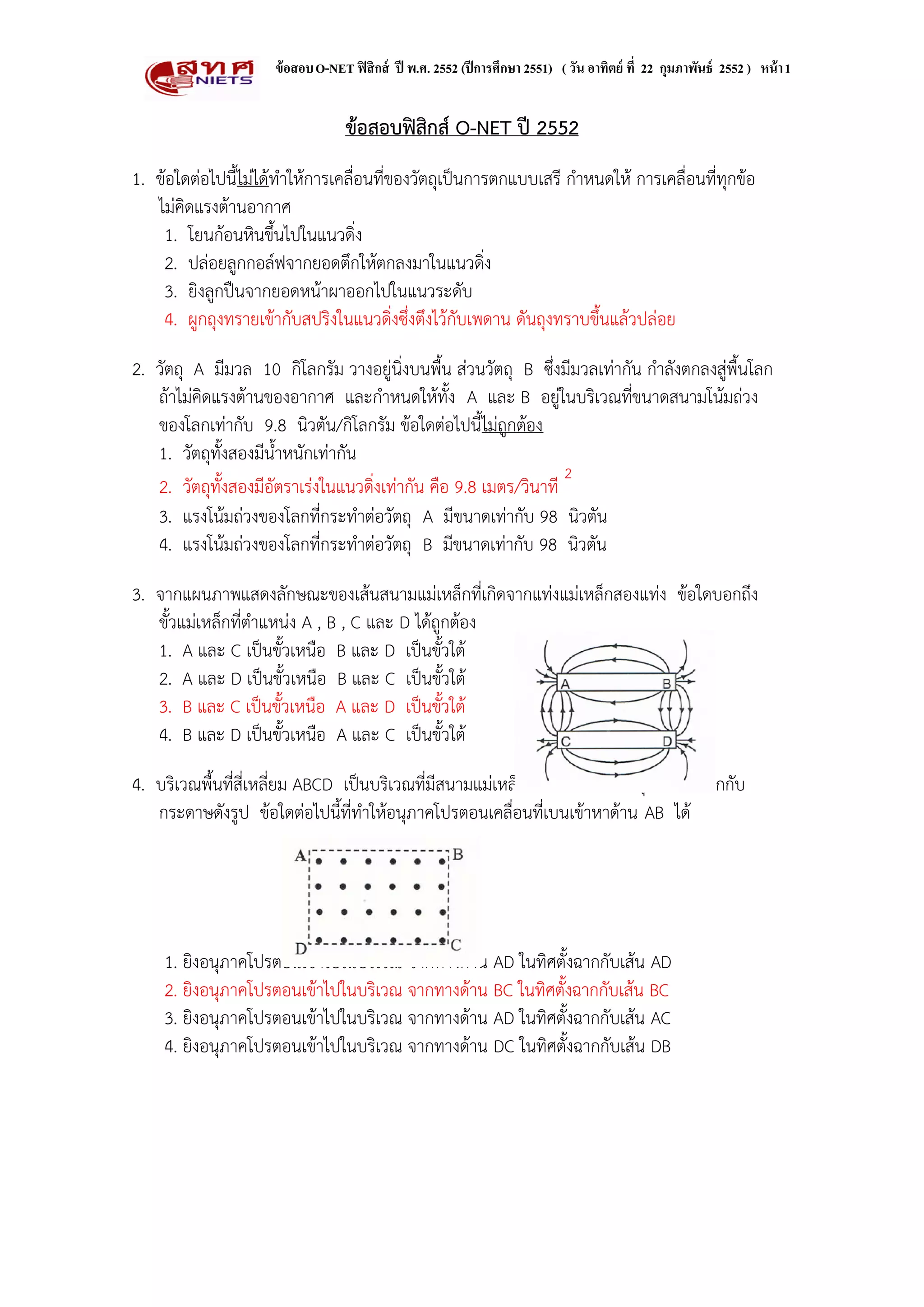 ข้ อสอบ O-NETฟิสิกส์ ปี พ.ศ. 2552 (ปี การศึกษา 2551) ( วัน อาทิตย์ ที่ 22 กุมภาพันธ์ 2552 ) หน้ า 1