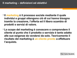 Il marketing è un processo sociale volto a soddisfare le esigenze dei clienti attraverso la creazione e il libero scambio di beni e servizi. Nel settore televisivo italiano, esiste una diffidenza verso il marketing a causa della percezione della televisione come servizio pubblico e creativamente ispirato, ma oggi il marketing è diventato centrale per decisioni strategiche e operative. La competizione globale e l'evoluzione della clientela richiedono un marketing management efficace per affrontare le sfide del mercato.