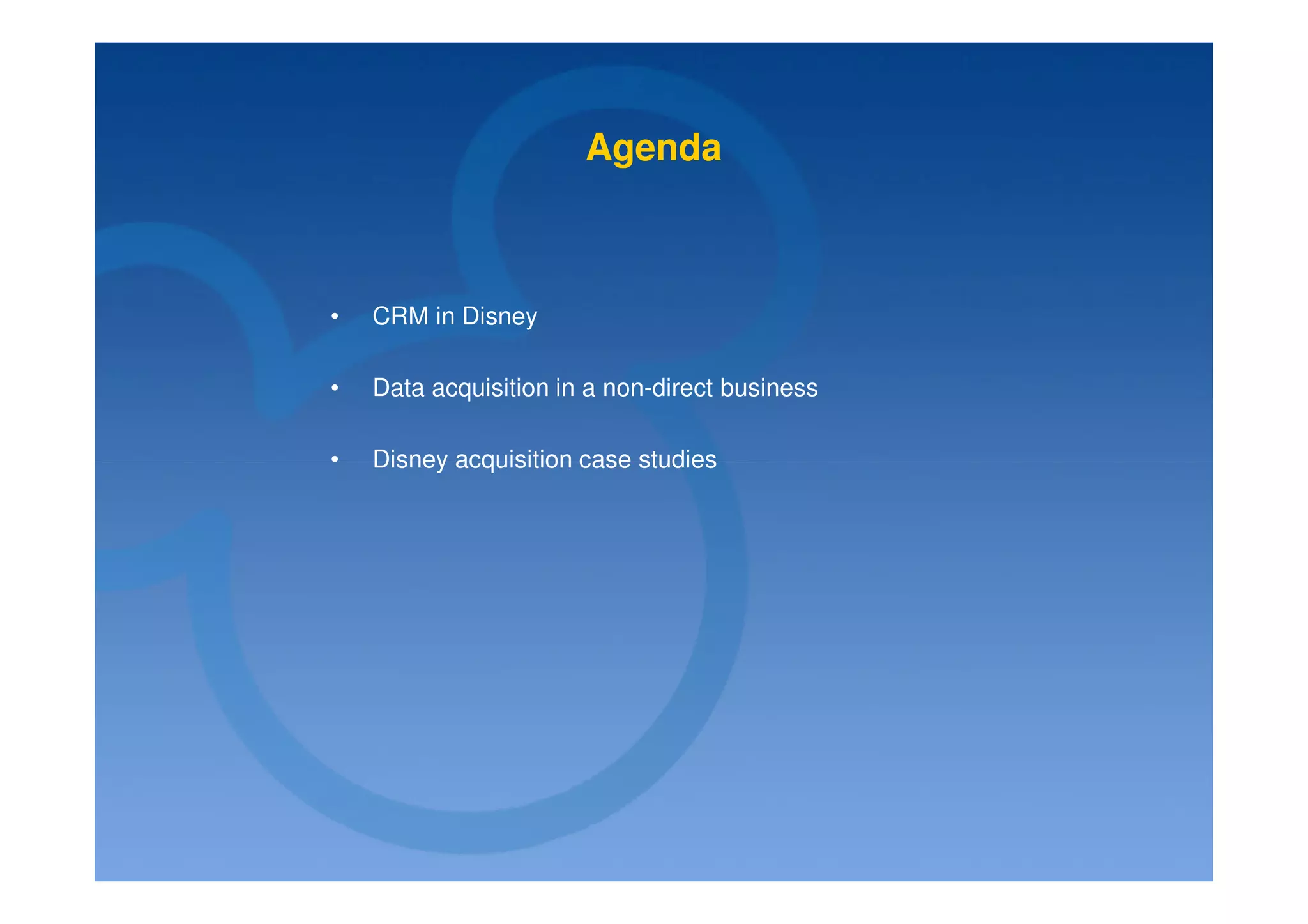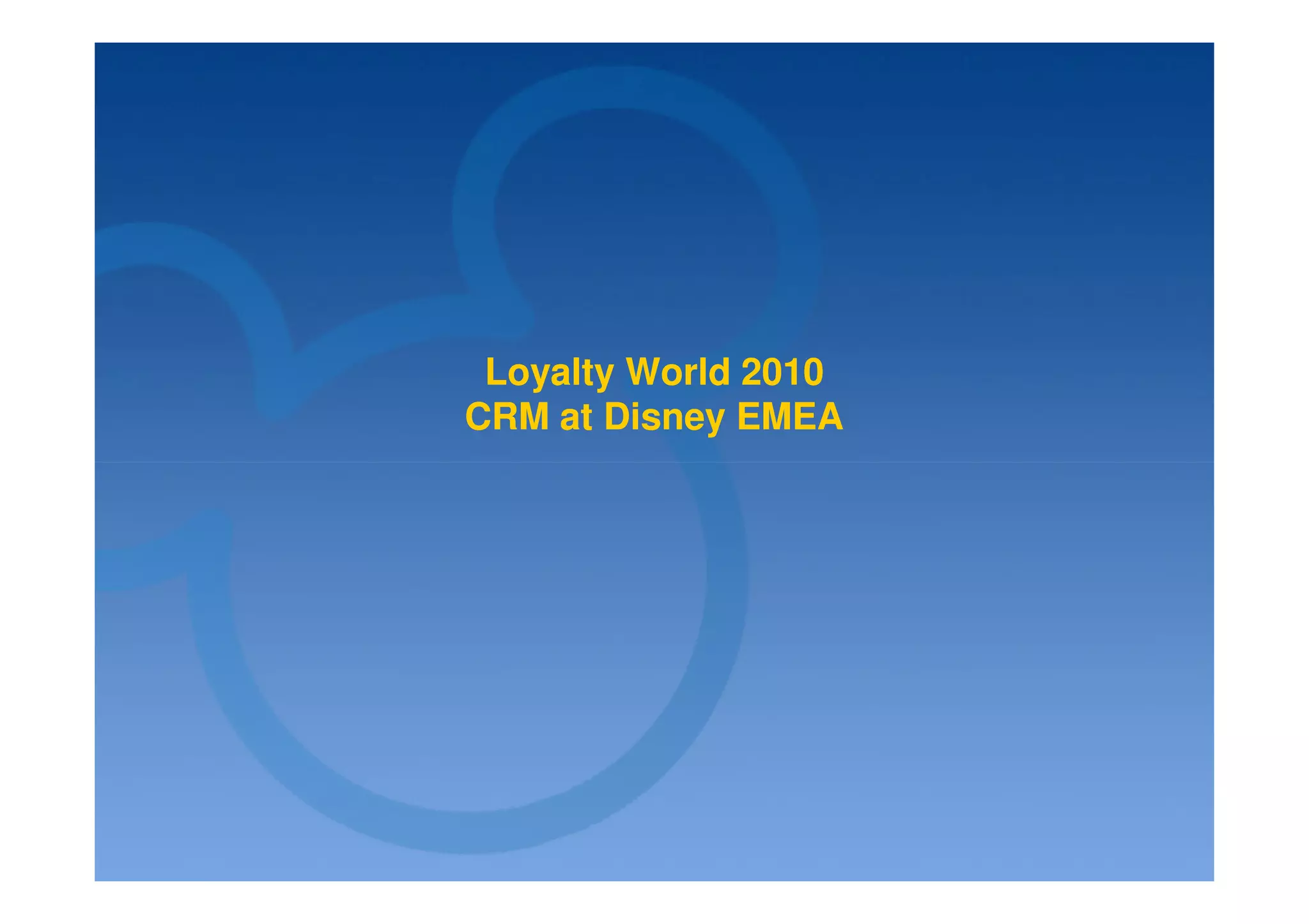 The document provides an overview of CRM practices at The Walt Disney Company EMEA. It discusses how Disney acquires customer data in its non-direct business segments and presents a case study on a promotion run by Disney Store to acquire customer data and drive store visits. It also summarizes Disney Movie Rewards, a loyalty program where customers earn points by purchasing Disney DVDs/Blu-rays that can be redeemed for rewards. The program saw strong early adoption with over 219k members in its first year.