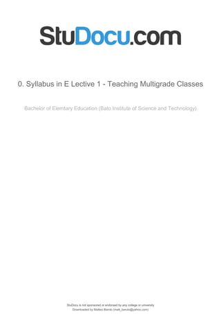 The document is a syllabus for a course on teaching multi-grade classes from the Bato Institute of Science and Technology. It outlines the course objectives, which are to demonstrate an understanding of theories and concepts of multi-grade learning, display knowledge of pedagogical approaches for different grade levels, and employ effective teaching strategies in a multi-grade classroom. The syllabus provides a weekly schedule over 10 weeks, dividing the course content into 8 modules that will address topics like the structure of multi-grade programs, principles of multi-grade teaching, classroom diversity, and the roles and responsibilities of multi-grade teachers. Students will be assessed through quizzes, assignments, exams and other activities completed both individually and collaboratively online