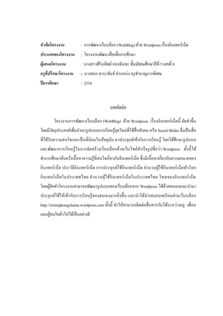: การพัฒนาเว็บบล็อก (WebBlog) ด้วย Wordpress เรื่ องอินเทอร์เน็ต ประเภทของโครงงาน : โครงงานพัฒนาสื่ อเพื่อการศึกษา ผู้เสนอโครงงาน : นางสาวศิรินทิพย์ กองฉันทะ ชั้นมัธยมศึกษาปี ที่ 5 เลขที่ 8 ครู ทปรึกษาโครงงาน ี่ : นางสมร ตาระพันธ์ ตาแหน่ง ครู ชานาญการพิเศษ ปี การศึกษา : 2554 บทคัดย่อ โครงงานการพัฒนาเว็บบล็อก (WebBlog) ด้วย Wordpress เรื่ องอินเทอร์ เน็ตนี้ จัดทาขึ้น โดยมีวตถุประสงค์เพื่อนาเอารู ปแบบการเรี ยนรู ้ยุคใหม่ที่ใช้สื่อสังคม หรื อ Social Media ซึ่ งเป็ นสื่ อ ั ที่ได้รับความสนใจและเป็ นที่นิยมในปั จจุบน มาประยุกต์เข้ากับการเรี ยนรู ้ โดยได้ศึกษารู ปแบบ ั และพัฒนาการเรี ยนรู้ ในการจัดสร้ างเว็บบล็อกด้วยเว็บไซต์สาเร็ จรู ปชื่ อว่า Wordpress ทั้งนี้ ได้ ทาการศึกษาค้นคว้าเนื้ อหาความรู ้ที่สนใจเกี่ยวกับอินเทอร์ เน็ต ซึ่ งมีเนื้ อหาเกี่ยวกับความหมายของ อิ นเทอร์ เน็ ต ประวัติอินเทอร์ เน็ ต การประยุกต์ใช้อินเทอร์ เน็ ต จานวนผูใช้อินเทอร์ เน็ ตทัวโลก ้ ่ อิ น เทอร์ เ น็ ต ในประเทศไทย จ านวนผุ ้ใ ช้อิ น เทอร์ เ น็ ต ในประเทศไทย โทษของอิ น เทอร์ เ น็ ต โดยผูจดทาโครงงานสามารถพัฒนารู ปแบบของเว็บบล็อกจาก Wordpress ได้ดวยตนเองและนามา ้ั ้ ประยุกต์ใช้ให้เข้ากับการเรี ยนรู ้ ของตนเองมากยิ่งขึ้ น และนาได้นาเสนอบทเรี ยนผ่านเว็บบล็อก http://sirintipkongchanta.wordpress.com ทั้งนี้ ทาให้สามารถติดต่อสื่ อสารกันได้ระหว่างครู เพื่อน และผูสนใจทัวไปได้เป็ นอย่างดี ้ ่