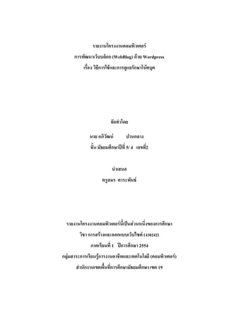 การพัฒนาเว็บบล็อก (WebBlog) ด้วย Wordpress เรื่อง วิธีการใช้และการดูแลรักษาโน๊ตบุค จัดทาโดย นาย อภิวัฒน์ ปานกลาง ชั้น มัธยมศึกษาปีที่ 5/ 4 เลขที2 ่ นาเสนอ ครูสมร ตาระพันธ์ รายงานโครงงานคอมพิวเตอร์นี้เป็นส่วนหนึ่งของการศึกษา วิชา การสร้างและออกแบบเว็บไซต์ (ง30242) ภาคเรียนที่ 1 ปีการศึกษา 2554 กลุ่มสาระการเรียนรู้การงานอาชีพและเทคโนโลยี (คอมพิวเตอร์) สานักงานเขตพื้นที่การศึกษามัธยมศึกษา เขต 19