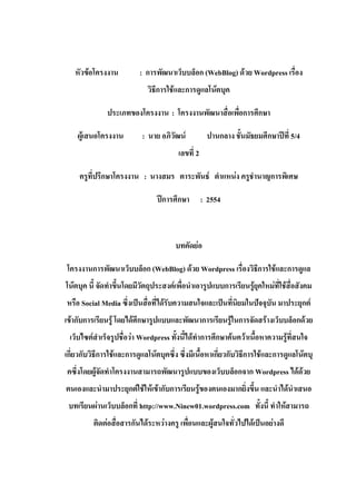 : การพัฒนาเว็บบล็อก (WebBlog) ด้วย Wordpress เรื่อง วิธีการใช้และการดูแลโน๊ตบุค ประเภทของโครงงาน : โครงงานพัฒนาสื่อเพื่อการศึกษา ผู้เสนอโครงงาน : นาย อภิวัฒน์ ปานกลาง ชั้นมัธยมศึกษาปีที่ 5/4 เลขที่ 2 ครูที่ปรึกษาโครงงาน : นางสมร ตาระพันธ์ ตาแหน่ง ครูชานาญการพิเศษ ปีการศึกษา : 2554 บทคัดย่อ โครงงานการพัฒนาเว็บบล็อก (WebBlog) ด้วย Wordpress เรื่องวิธีการใช้และการดูแล โน๊ตบุค นี้ จัดทาขึ้นโดยมีวัตถุประสงค์เพื่อนาเอารูปแบบการเรียนรู้ยุคใหม่ที่ใช้สื่อสังคม หรือ Social Media ซึ่งเป็นสื่อที่ได้รับความสนใจและเป็นที่นิยมในปัจจุบัน มาประยุกต์ เข้ากับการเรียนรู้ โดยได้ศกษารูปแบบและพัฒนาการเรียนรู้ในการจัดสร้างเว็บบล็อกด้วย ึ เว็บไซต์สาเร็จรูปชื่อว่า Wordpress ทั้งนี้ได้ทาการศึกษาค้นคว้าเนื้อหาความรู้ที่สนใจ เกี่ยวกับวิธีการใช้และการดูแลโน๊ตบุคซึ่ง ซี่งมีเนื้อหาเกี่ยวกับวิธีการใช้และการดูแลโน๊ตบุ คซึงโดยผู้จดทาโครงงานสามารถพัฒนารูปแบบของเว็บบล็อกจาก Wordpress ได้ด้วย ่ ั ตนเองและนามาประยุกต์ใช้ให้เข้ากับการเรียนรู้ของตนเองมากยิ่งขึ้น และนาได้นาเสนอ บทเรียนผ่านเว็บบล็อกที่ http://www.Ninew01.wordpress.com ทั้งนี้ ทาให้สามารถ ติดต่อสื่อสารกันได้ระหว่างครู เพื่อนและผู้สนใจทั่วไปได้เป็นอย่างดี