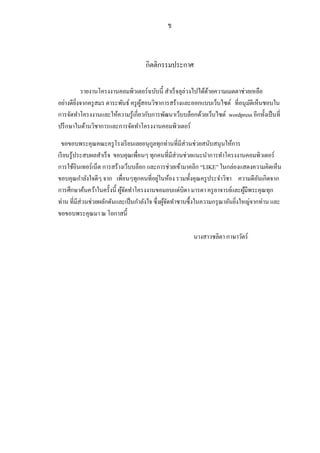 กิตติกรรมประกาศ รายงานโครงงานคอมพิวเตอร์ฉบับนี้ สาเร็ จลุล่วงไปได้ดวยความเมตตาช่วยเหลือ ้ อย่างดียงจากครู สมร ตาระพันธ์ ครู ผสอนวิชาการสร้างและออกแบบเว็บไซต์ ที่อนุมติเห็นชอบใน ิ่ ู้ ั การจัดทาโครงงานและให้ความรู้เกี่ยวกับการพัฒนาเว็บบล็อกด้วยเว็บไซต์ wordpress อีกทั้งเป็ นที่ ปรึ กษาในด้านวิชาการและการจัดทาโครงงานคอมพิวเตอร์ ขอขอบพระคุณคณะครู โรงเรี ยนเลยอนุกลทุกท่านที่มีส่วนช่วยสนับสนุนให้การ ู เรี ยนรู้ประสบผลสาเร็ จ ขอบคุณเพื่อนๆ ทุกคนที่มีส่วนช่วยแนะนาการทาโครงงานคอมพิวเตอร์ การใช้อินเทอร์เน็ต การสร้างเว็บบล็อก และการช่วยเข้ามาคลิก “LIKE” ในกล่องแสดงความคิดเห็น ขอบคุณกาลังใจดีๆ จาก เพื่อนๆทุกคนที่อยูในห้อง รวมทั้งคุณครู ประจาวิชา ความดีอนเกิดจาก ่ ั การศึกษาค้นคว้าในครั้งนี้ ผูจดทาโครงงานขอมอบแด่บิดา มารดา ครู อาจารย์และผูมีพระคุณทุก ้ั ้ ท่าน ที่มีส่วนช่วยผลักดันและเป็ นกาลังใจ ซึ่งผูจดทาซาบซึ้งในความกรุ ณาอันยิงใหญ่จากท่าน และ ้ั ่ ขอขอบพระคุณมา ณ โอกาสนี้ นางสาวชลิตา กาษาวัตร์