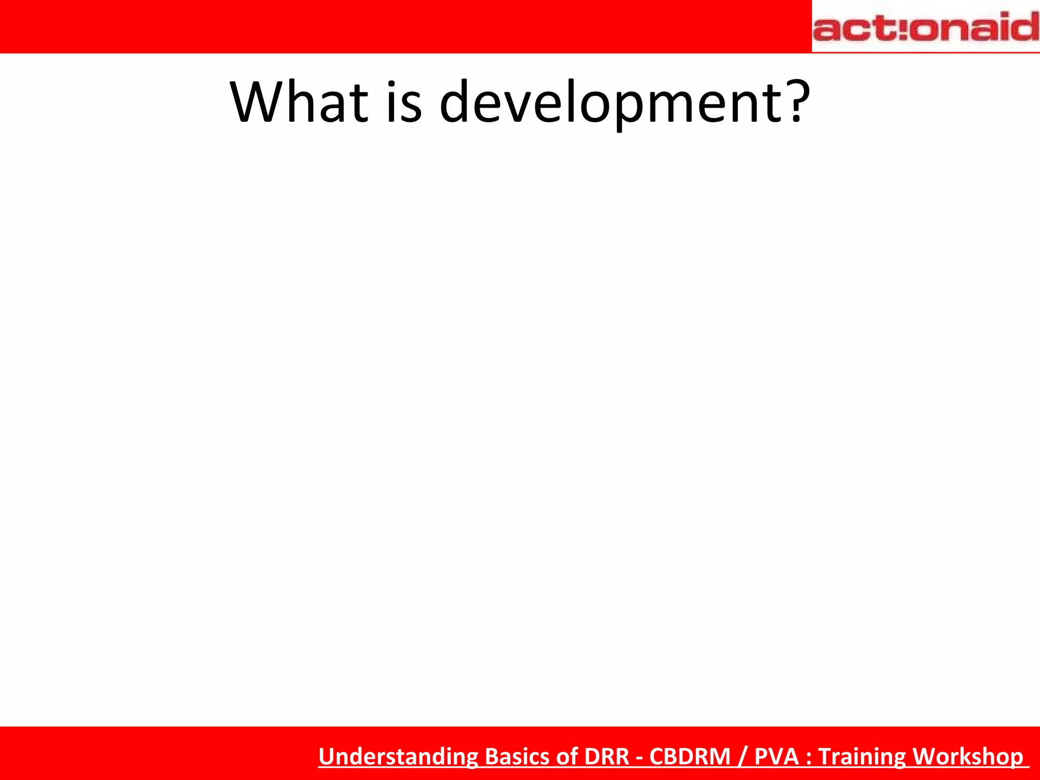 The document discusses the relationship between development and disasters. It notes that development can both increase and decrease vulnerability to disasters. Development can increase vulnerability by encouraging population growth in hazardous areas and damaging the environment. However, development can also reduce vulnerability through infrastructure like earthquake-resistant buildings. While disasters can disrupt development, they can also provide opportunities for rebuilding safer structures and improving systems. Overall, the document examines how development and disasters intersect and influence each other in both positive and negative ways.